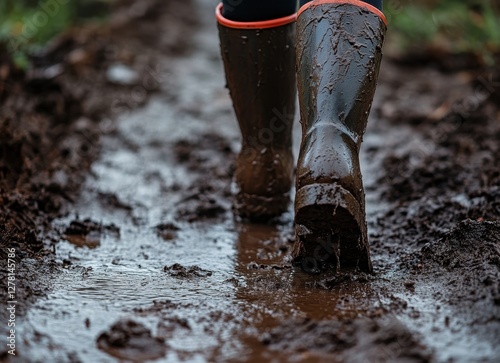 Close-Up of Rubber Boots Stepping Through Mud: A Textured Journey in Nature's Element