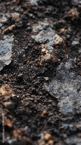 Close-up of rugged and textured mountain soil and rock surfaces, highlighting rough natural patterns, earthy tones, and weathered geological details with brown, gray, and orange variations.