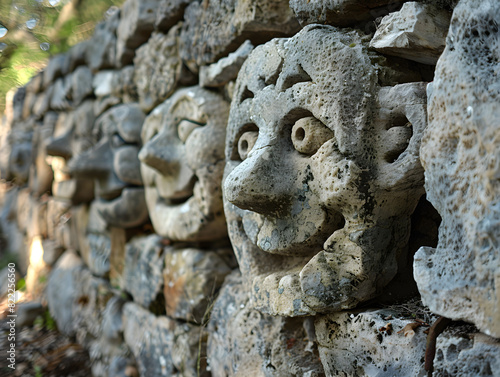 Close-Up of Rustic Stone Wall with Intricate Carvings of Smiling Faces Weathered Texture and Ancient Aesthetic in Linear Perspective with Natural Lighting Highlights Historical and Cultural