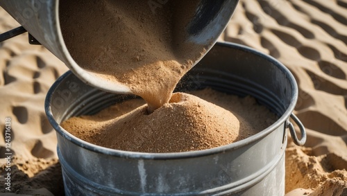 Closeup of sand being poured into a large metal container on the beach demonstrating construction or landscaping materials.