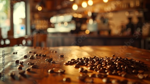 Close-up of scattered coffee beans on a wooden surface with a blurred background showcasing a cozy cafe ambiance