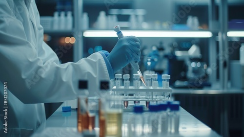 Close-up of scientists' hands making medicine in a modern lab with high-tech equipment and soft white lighting, showcasing research innovation atmosphere.