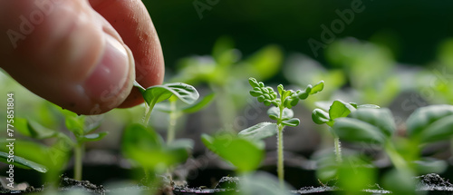 Closeup of seedling emerging from soil Gardening hands, botanical preservation imagery