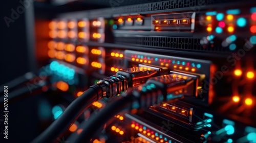 Closeup of server racks in a data center, with cables neatly organized and glowing indicator lights, ideal for representing powerful computing and network systems