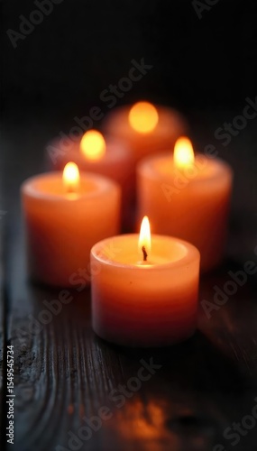Close-up of several flickering candles, casting a warm, inviting glow on a dark wooden surface Perfect for relaxation, meditation, or spiritual themes , wax, vintage, wooden