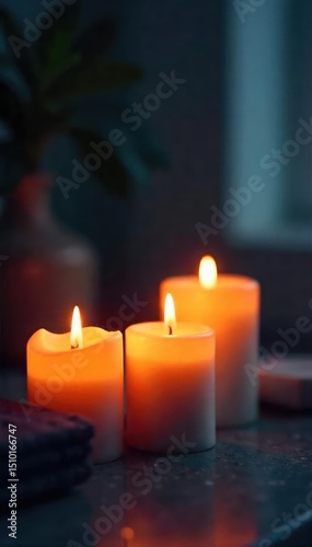 Close-up of several flickering candles, creating a warm, soft glow in a dimly lit room, suggesting relaxation and stress relief Perfect for spa, wellness, or self-care themes , glow, wellbeing