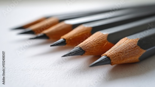Close-up of sharp graphite pencils creating a minimalist art display on white surface