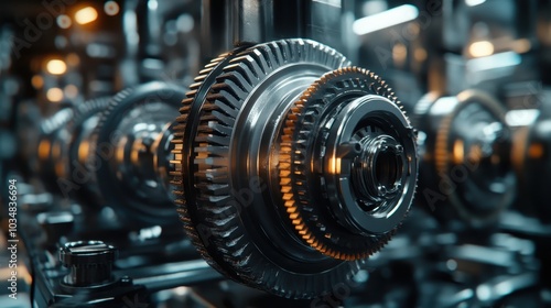 Close-Up of Shiny Metallic Gears in a Modern Industrial Machine with Intricate Details and Reflections in a High-Tech Manufacturing Environment