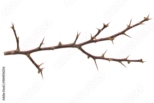 Close-up of single brown thistle plant with green leaves. Side angle view shows stem extending from bottom left to top right. Stark isolated transparent background makes thistle focal point. Cut out.
