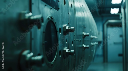 Close-up of sleek metallic nuclear payload container in modern control room, showcasing high-tech security and precision in nuclear operations.