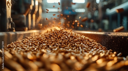 Close-up of small brown cylindrical pellets pouring onto a conveyor belt in an industrial factory setting with warm lighting and blurred background machinery