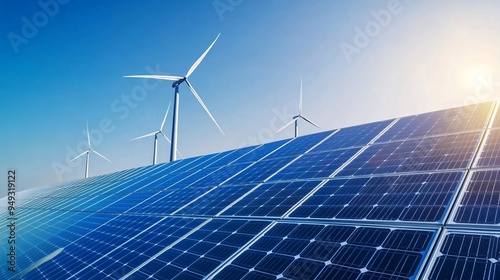 Close-up of solar panels absorbing sunlight with windmills in the background providing additional energy