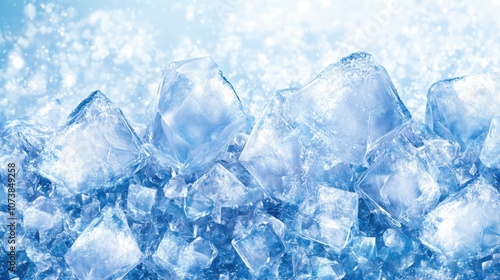 Close-up of sparkling ice cubes in a shimmering blue background, creating a refreshing and cool atmosphere.