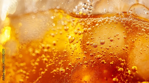 Close-up of sparkling soda with ice cubes, featuring the effervescent bubbles and deep amber hues. Perfect for beverage-related content and promotional visuals.