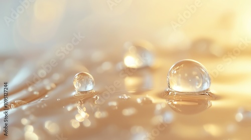Close-up of sparkling water droplets on a smooth surface, capturing a serene and refreshing essence in soft light.