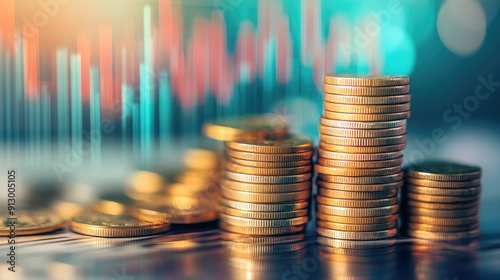 Close-up of stacked coins with a financial chart in the background, illustrating economic success.