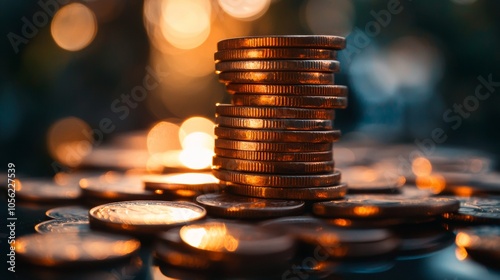 Close-up of stacked gold coins with warm bokeh lighting