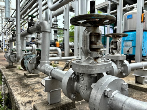 Close-up of stainless steel industrial piping system with valves and control components in a factory. Used in fluid transfer, process engineering, and manufacturing environments.