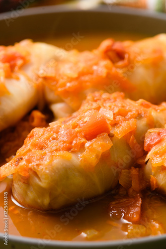 Close-up of stuffed cabbage rolls in tomato sauce.
