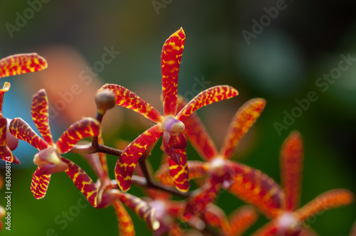 Close-up of stunning Arachnis orchids with vibrant orange and maroon petals, captured in natural daylight with a beautiful bokeh background.