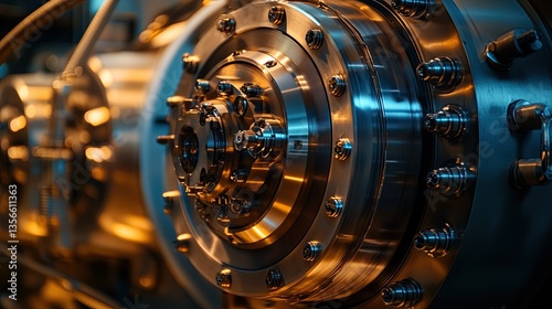Close-up of superconducting magnets used in fusion containment systems, cooling systems visible.