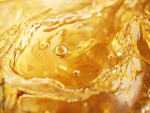 Close-up of swirling, golden liquid with bubbles.