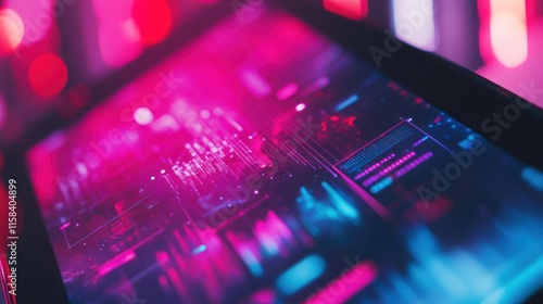 Close-up of tablet displaying vibrant digital data and graphs with neon pink and blue lighting.
