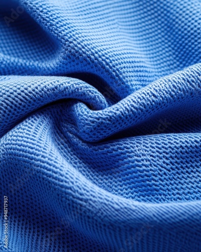 Close-up of textured blue fabric showcasing intricate weave patterns, ideal for textile design and fashion projects.