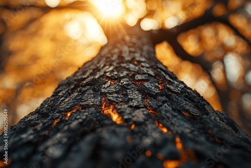 Close-up of textured tree bark with warm sunlight filtering through, creating a dramatic autumn forest scene with rich orange tones.