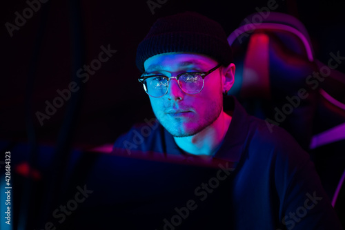 Close-up of the face of a professional video game player at an esports tournament. A cyberathlete wearing headphones and a headset.