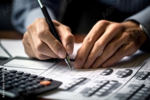 Close-up of the hands of an agile accountant, calculator. Generative AI.