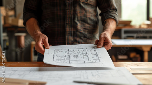Close-up of the hands of an interior architect-designer holding a sketch, drawing. Design studio. Concept of drawings, work with design.