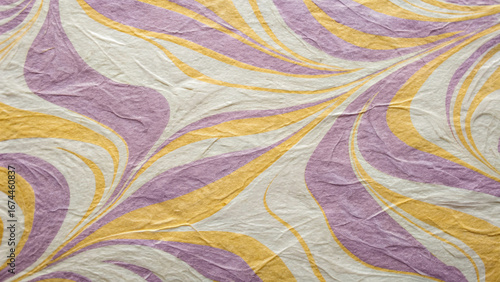 Close-up of the texture of mulberry paper with an abstract pattern in purple, yellow, and cream tones.