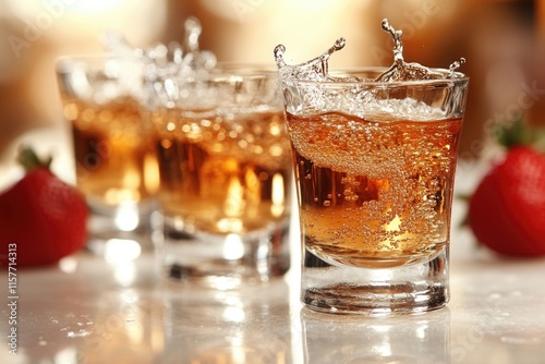 Close-up of three glasses filled with unknown liquids and strawberries in the background
