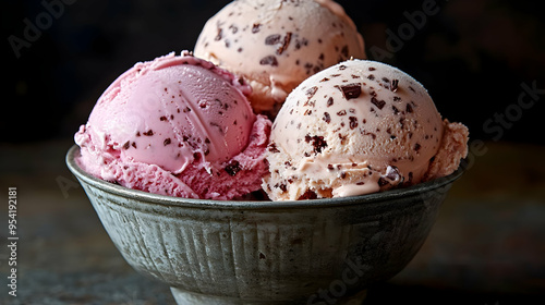 Closeup of three scoops of ice cream with chocolate chunks in a metal bowl.