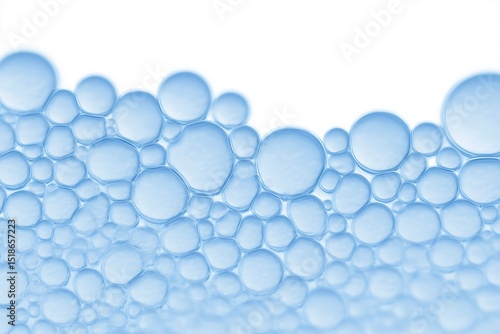 Close-up of translucent blue soap bubbles on a white background, showcasing various sizes and shapes, creating a visually appealing abstract pattern with a sense of freshness