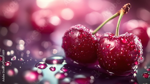 Close-up of two fresh cherries covered in water droplets against a blurred, colorful background, creating a vibrant, mouth-watering scene.