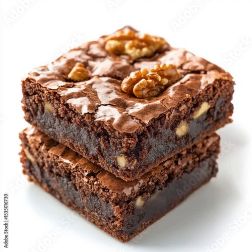 Close-up of two stacked chocolate brownies with walnuts on top, showing rich texture, chocolate glaze, and nut inclusions for dessert or sweet treat theme