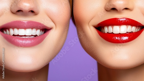 Close-up of two women's smiles with pink and red lipstick, showcasing healthy white teeth against a purple background.