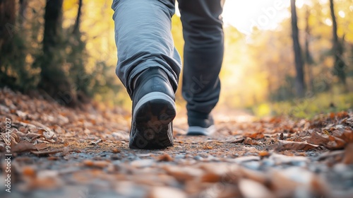 Close-up of Unrecognizable Mans Legs Walking on Serene Forest Trail Covered in Colorful Autumn Leaves