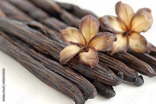 Close-Up of Vanilla Pods and Blooming Flowers on White
