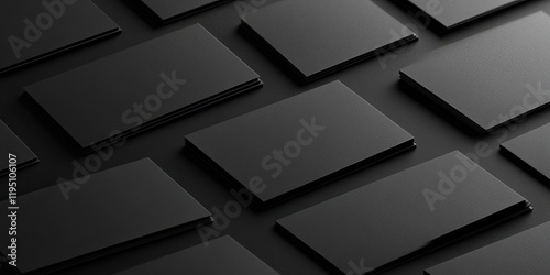 Closeup of various black business cards arranged on a dark textured surface with varying angles creating a sleek modern design mockup background
