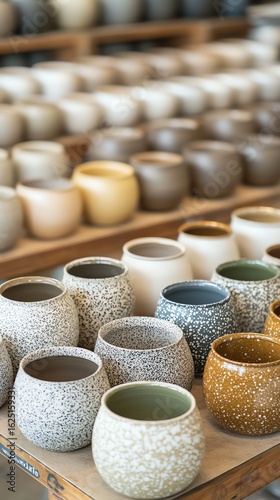 Close-up of various ceramic mugs in earthy tones displayed on wooden shelves in a cozy store setting.