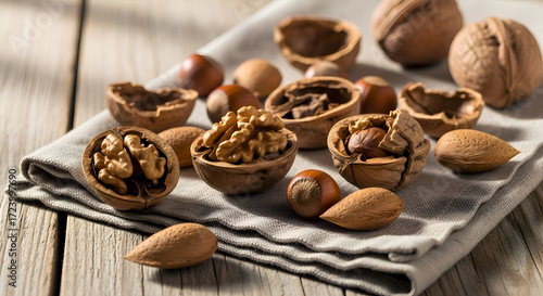 Close-up of various organic nuts on a wooden surface with a rustic appeal