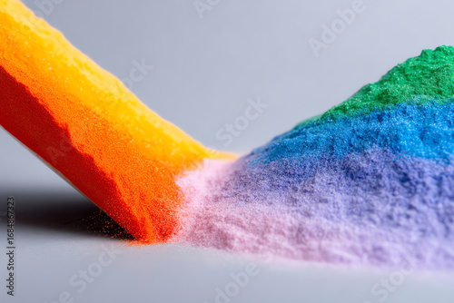 Close-up of vibrant colored powders blending from orange to green, creating a smooth gradient on a light surface with fine texture and detail