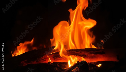 Close-up of vibrant flames dancing over burning logs in a dark setting