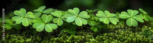 Close-up of vibrant green clover leaves growing on a bed of moss, creating a serene and peaceful nature scene. The lush greenery evokes feelings of tranquility and freshness.