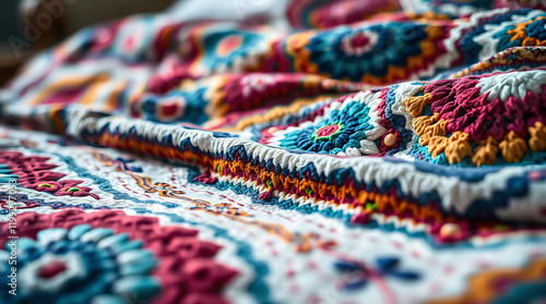 Close-up of Vibrant Handmade Crochet Mandala Tapestry. Colorful Textile Art, Perfect for Home Decor. Unique Ethnic Design and Needlework Pattern.