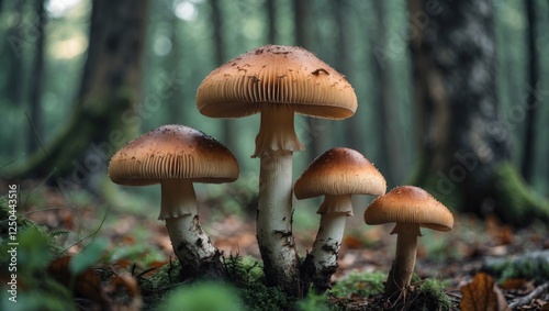 Closeup of vibrant mushrooms in a serene forest setting showcasing nature's details and textures in a tranquil atmosphere.