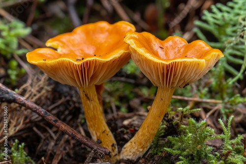Close-Up of Vibrant Orange Wild Mushrooms Growing Naturally in Forest Environment Captured with Generative AI